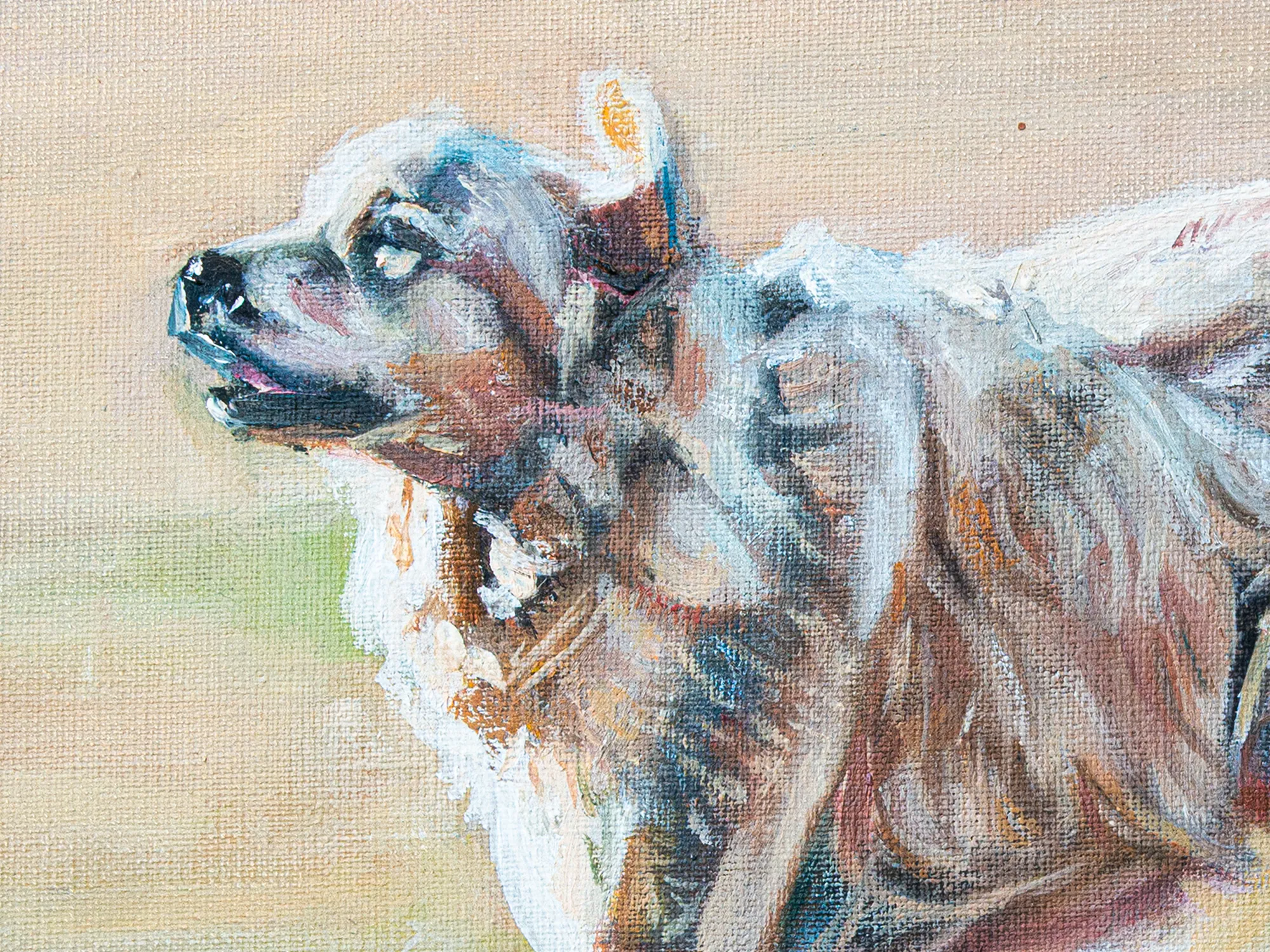 A painting of a running dog rendered in loose, layered brushstrokes. The scene shows a field of cut grass in muted earth tones and soft greens. Light from the left casts a long shadow beneath the dog, leaving most of its body in shadow while the contours are strongly highlighted. The dog’s white fur with light brown patches reflects the blue of the clear sky.